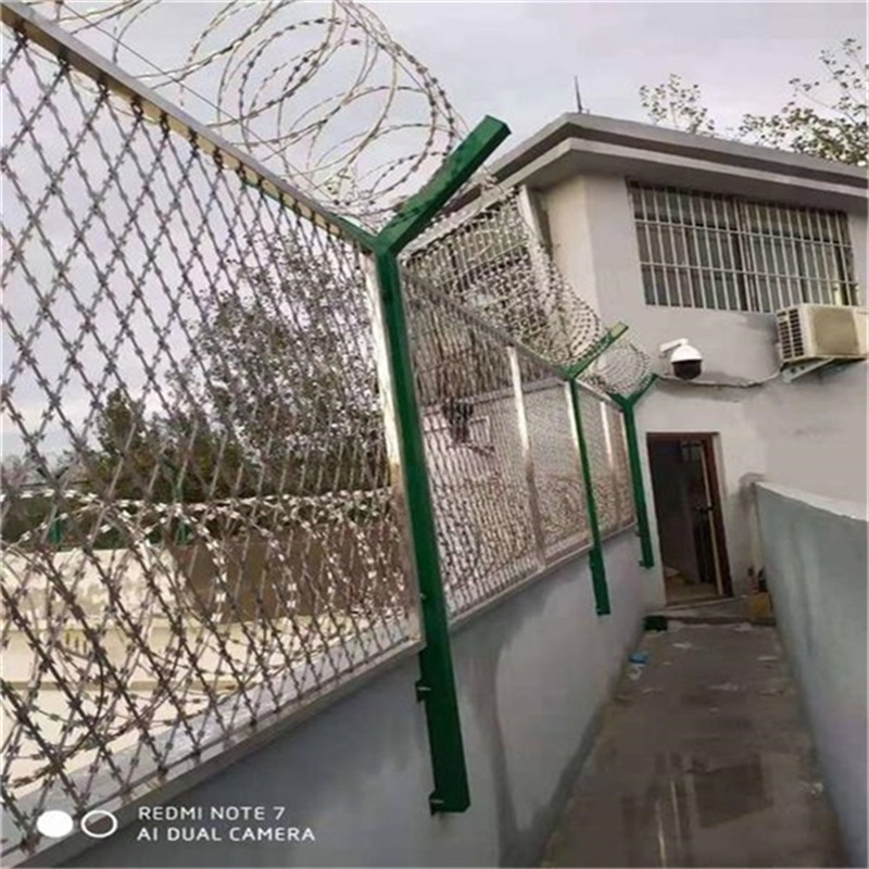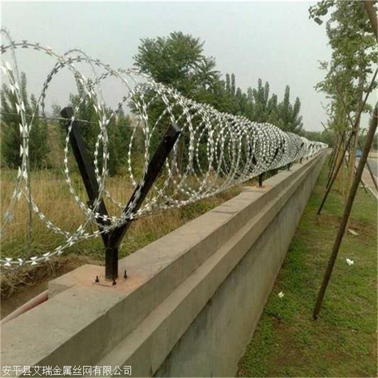 第二種,在刀刺網(wǎng)安裝的過程中,可根據(jù)圍墻的長度設(shè)計需要使用多少根Y字支架,一般以5-10cm的間距為好,把Y字型支架固定在圍墻上面,其中Y字形支架可根據(jù)您的實際情況進行打孔,以此為了安裝刀刺網(wǎng)的時候起到固定的作用。然后刀刺網(wǎng)的Y字支架上兩邊各拉一根鋼絲,對刀刺網(wǎng)加以固定,以免左右搖晃。